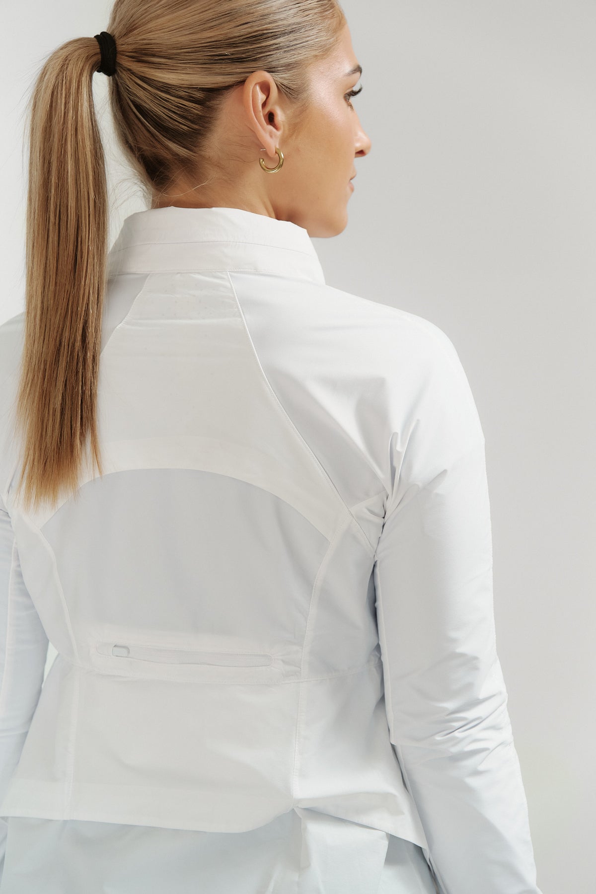 A discreet zip pocket at the lower back keeps essentials secure on the move, while soft, stretchy inner cuffs offer a close, comfortable fit at the wrists. Reflective dots on the front and back keep you visible when the light fades.
